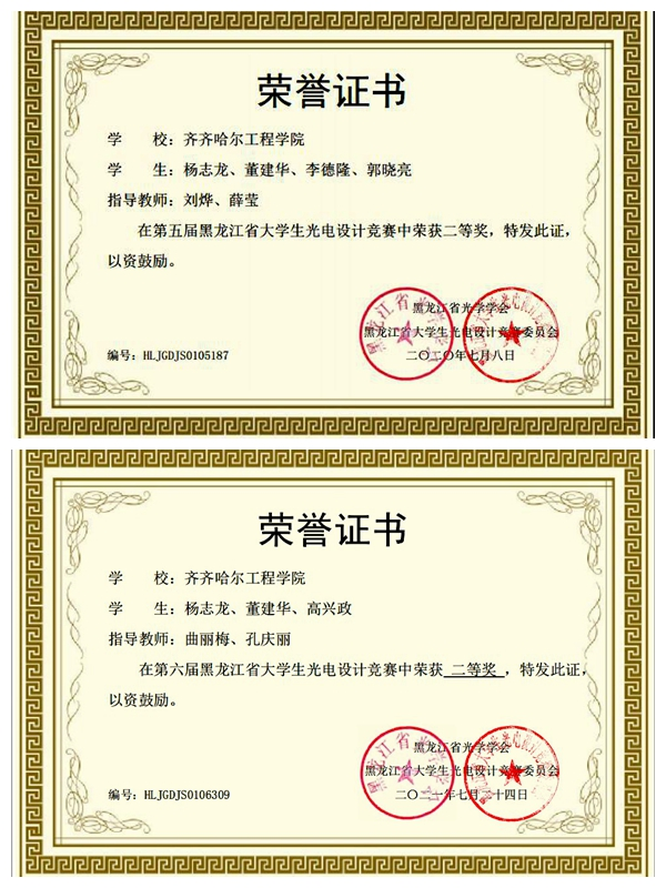2021年,他在第五届黑龙江省大学生光电设计竞赛上荣获二等奖;2022年,他在第六届黑龙江省大学生光电设计竞赛上荣获二等奖。他深知,学校意在通过“以赛促学、以赛促教”,实现课赛融合的教育模式培养全面发展的高素质人才,这也是董建华一直以来的目标,他相信,敢于尝试,才能无悔青春时光。
