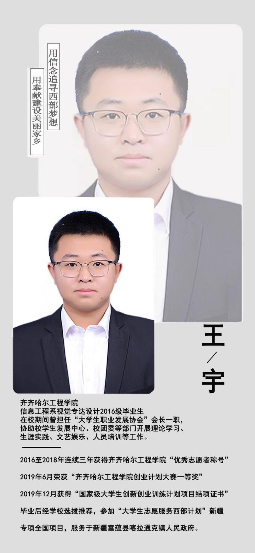 服务结束回到家乡后,他依靠自身专业优势,担任黑龙江沐珩广告设计公司设计师,工作期间依然没有忘记党和国家的教诲,始终不忘初心从事志愿服务工作,并发挥自身基层工作的优势,不仅帮助辖区社区及其他单位在外宣海报、党建展板、活动视频等工作上提供建设性意见,而且担任设计制作,为宣传家乡品牌,文化助力乡村振兴贡献着自己的力量。