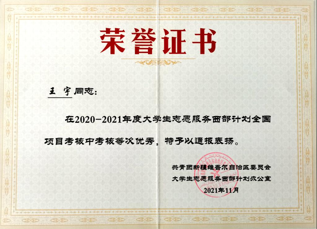 服务期间,他时常提及并感谢自己的母校。在校四年的学习中,他不仅专业基础扎实,志愿服务也从未落下。这为他更好地开展基层服务工作奠定了基础。因为语言不通是工作开展的最大障碍,他自创了一套沟通方法,了解群众所想所需,帮助群众解决生活中的实际困难。在一次入户走访中,一位阿姨因社保系统问题一直交不上社保款,这使得她很焦急。在得知情况后,王宇一边安抚阿姨,一边联系相关部门,积极去解决问题。他说:“作为一名基层工作者,应具备为群众服务的思想觉悟,群众的事都是大事,自己的事都是小事。”