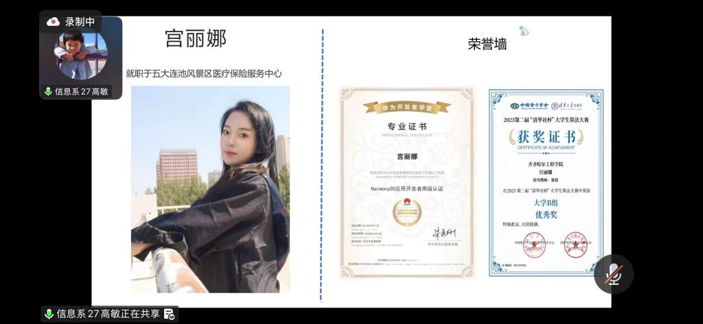为助力学生明确职业发展方向、掌握求职备考技巧,进一步搭建校友与在校学子之间的沟通桥梁,近日,信息学院数据科学与大数据技术专业通过腾讯会议平台,举办了第三十一期校友故事汇暨求职经验分享会。本次分享会由专业长高敏主持,邀请优秀校友宫丽娜分享求职与备考经验,大数据专业百余名同学在线参与。