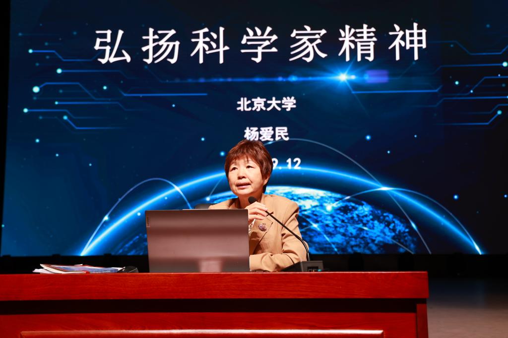 启动仪式结束后,在学术交流环节中,北京大学管理学博士杨爱民教授作了题为《弘扬科学家精神》的主旨报告,系统阐述了科学家精神的核心内涵,通过生动讲述科学家的感人事迹及其对青年学子的殷切寄语,深入解读了这一精神的时代价值。同时,她还结合现实案例,就“如何将科学家精神融入日常学习与成长实践”提出了具体建议,引导同学们思考自身责任与前行方向。