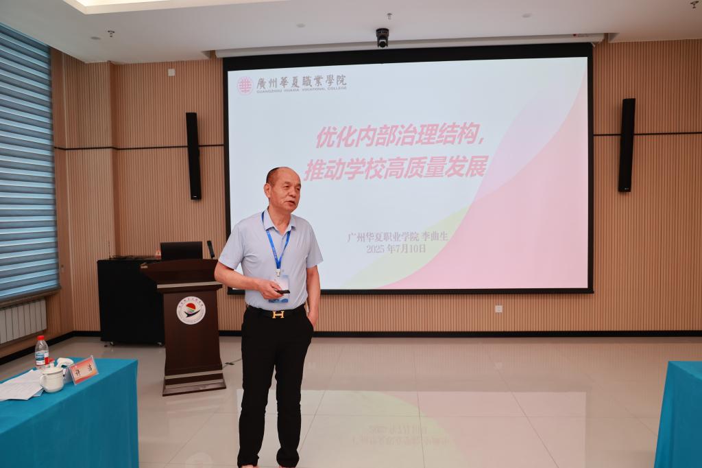 广州华夏职业学院副董事长李曲生以“优化内部治理结构,推动学校高质量发展”为题,介绍了学校发展、学校荣誉、内部治理模式,并分享了1133治理模式。即“1”—加强党的领导。坚持和加强党对民办高校的全面领导,是中国特色社会主义教育的最显著特色之一;“1”—董事会科学决策。董事会在民办高校内部治理中处在关键核心地位;“3”—党委、校行政和学术(教学)委员会三驾马车协调有序运转;“3”—纪委、教代会、监事会在学校治理中进行监督保障。
