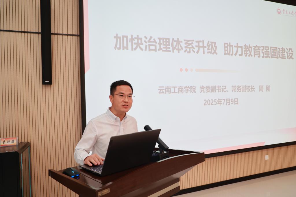 云南工商学院常务副校长周刚以“加强治理体系升级,助力教育强国建设” 为题,对筑基固本,规范治理体系;提质增效,提升内涵质量;锚定前瞻谋划,迎接未来挑战三方面内容进行分享,他指出,学院始终坚持高质量发展道路,锚定“申硕更大”战略目标,在治理现代化上再深化,在内涵建设上再突破、在服务发展上再提升。