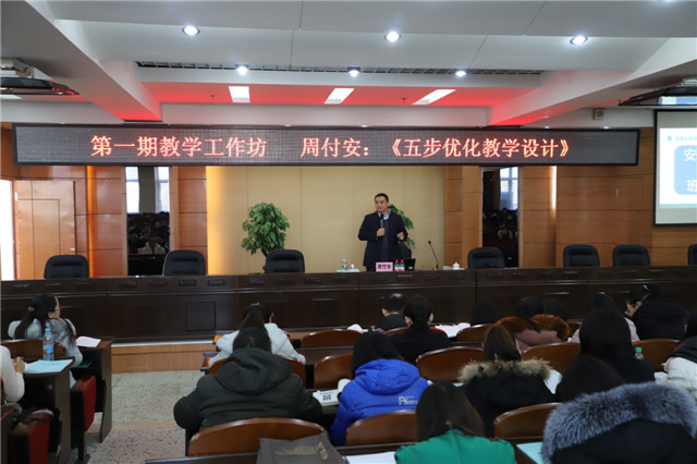1月8日,学院首届课程节活动之第一期教学工作坊在图书馆601报告厅举行,北京工商大学教学设计专家周付安应邀做“五步优化教学设计”专题培训。学院理事长曹勇安、副院长蒋春艳、副院长张振笋与各系部中心教师共200人...