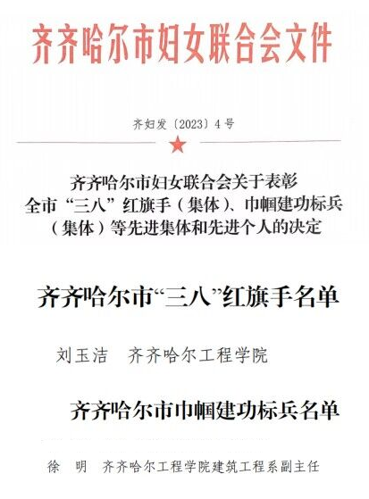 3月22日,齐齐哈尔市妇女联合会发布了“齐齐哈尔市妇女联合会关于表彰全市“三八”红旗手(集体)·巾帼建功标兵(集体)等先进集体和先进个人的决定”,我校刘玉洁老师获“市三八红旗手”、徐明老师获“市巾帼建功标兵”...