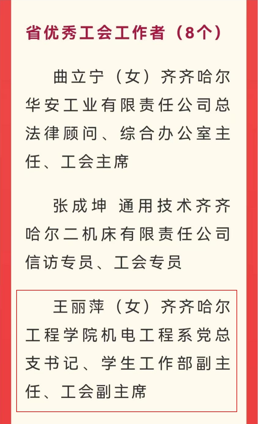 日前,黑龙江省总工会颁发了《黑龙江省总工会关于表彰省模范职工之家、省模范职工小家、省优秀工会工作者的决定》,学校工会副主席王丽萍榜上有名,荣获省优秀工会工作者荣誉称号。 王丽萍老师是硕士研究生,中共党员...