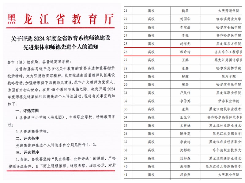 近日,2024年黑龙江省教育系统师德先进集体和先进个人评选结果公布。经过民主推荐,公开评选,我校康护工程系郭玲玲同志获评全省教育系统“师德先进个人”荣誉称号。我校已连续三年获此殊荣。为贯彻落实习近平总书记关于教育的重要论述和重要指示批示精神,大力弘扬教育家精神,营造尊师重教的浓厚氛围,激励学校全体教职工落实立德树人根本任务,积极投身学校教育教学事业。学校党委高度重视师德师风建设工作,通过建立和落...
