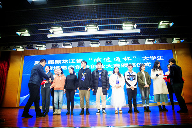 电商171班晋长鑫(左五)代表团队领奖 12月1日下午,在第三届黑龙江省“俄速通杯”大学生跨境电商创新创业大赛颁奖仪式上,学校电商171班学生晋长鑫、赵一丹、赵新彤组成的团队获颁最佳文案奖。本届大赛共颁发3个最佳...