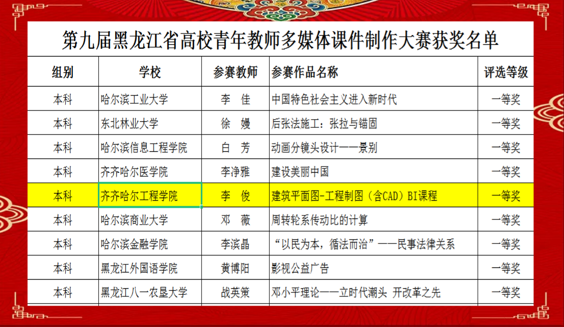 近日,我校建筑工程系教师李俊在第九届黑龙江省高校青年教师多媒体课件制作大赛中荣获本科组一等奖。 为推动高校教师更新教学理念和方法,促进现代教育信息技术在教学中的应用,经省教育厅批准,教育部全国高校教师...