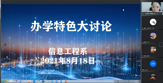 8月18日上午,信息工程系组织全体教工通过腾讯会议平台召开办学特色大讨论启动会,会议由系负责人刘春媛主持。 会上,信息工程系负责人刘春媛首先对学院《关于组织开展学校办学特色大讨论的通知》的文件进行解读,针...