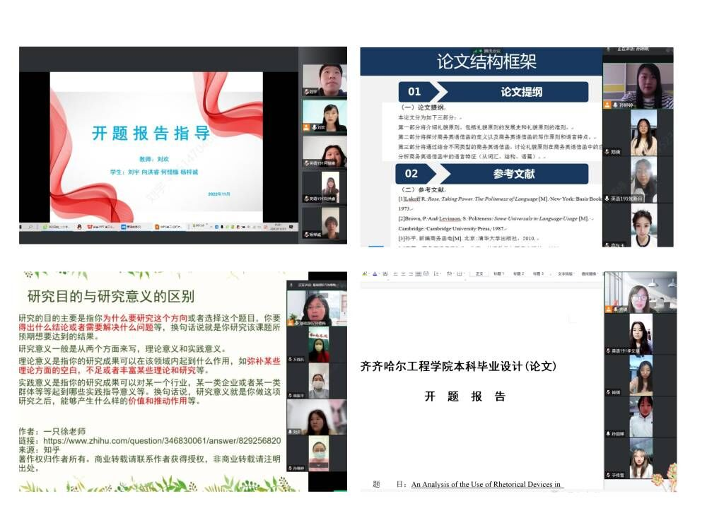 11月21日至24日,在英语专业统筹安排下,各论文指导教师相继从论文研究目的和意义、国内外研究现状、学术准备情况、研究思路及方法、确定提纲等方面对学生如何撰写开题报告进行详细的指导。经过指导,英语专业2019级...