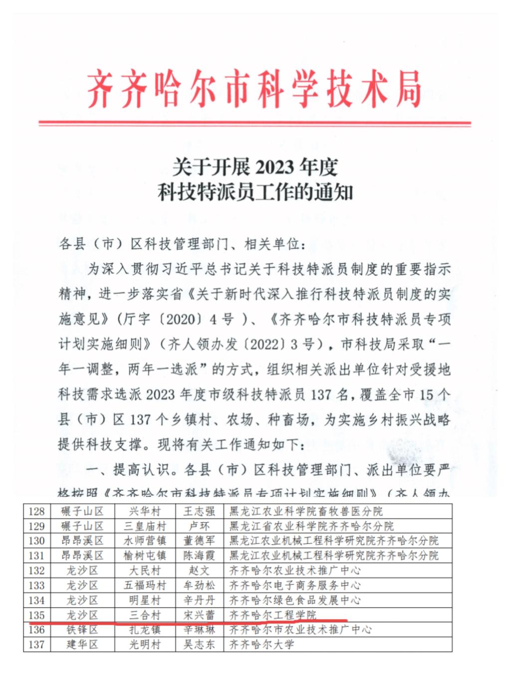 近日,经学校推荐,市科技局审核,市人才工作领导小组办公室备案,我校建筑工程系风景园林专业教师宋兴蕾入选2023年度市级科技特派员。 根据我市的实际需求和派出计划,宋兴蕾被派驻齐齐哈尔市龙沙区大民街道三合村开...