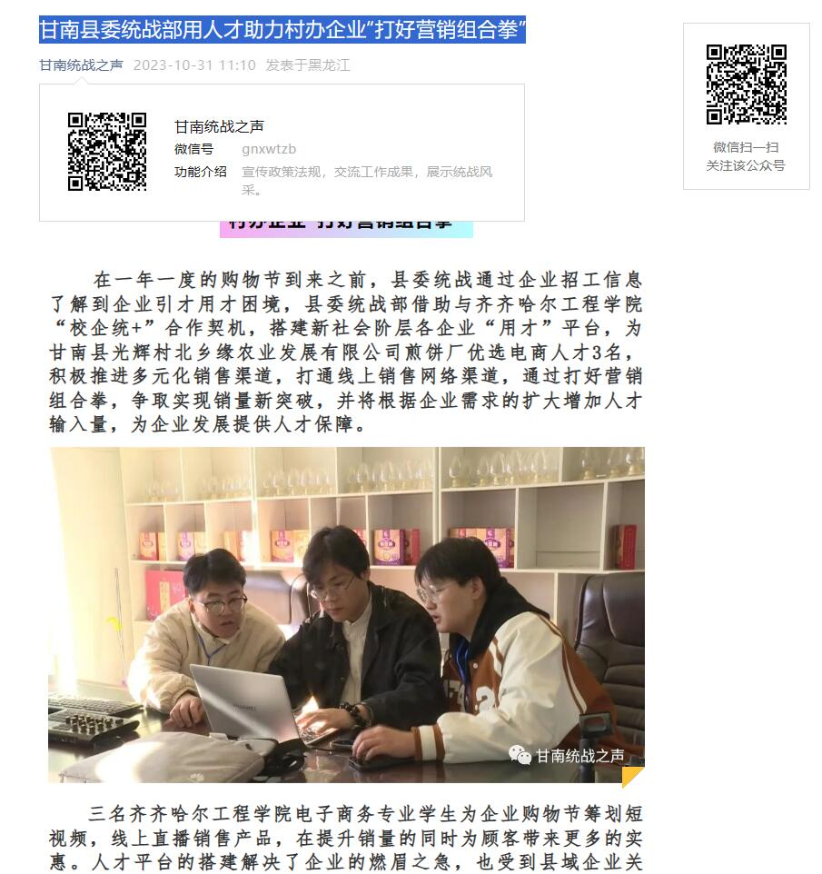10月31日,甘南县委统战部官媒以《甘南县委统战部用人才助力-村办企业“打好营销组合拳”》为题,肯定了j9在线管理工程系校外课堂学生对县域经济发展的积极作用,为县域企业提质增效作出了积极贡献。新闻强调了“甘南县委统战部将主动融入县域发展大局,坚持“统战+人才”的工作新机制,优化营商环境,围绕电商和农副产品深加工发掘人才,为企业解决人才短缺的困境,助力乡村振兴。与此同时,校外课堂的创新又为高...