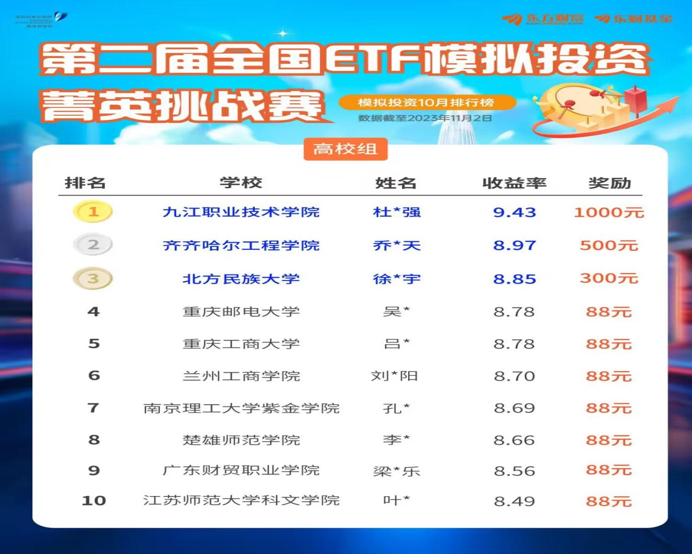 11月21日,第二届全国ETF模拟投资箐英挑战赛官方发布阶段性结果,学校管理工程系互联网金融专业2021级学生乔作天凭借出色的投资策略和扎实的专业知识,荣获全国第二名。全国ETF模拟投资箐英挑战赛旨在通过模拟投资、在线答题、线上视频及线下科普等多种方式引导广大普通投资者了解ETF投资知识,让参赛者体验ETF的投资魅力,激发投资热情,培养参赛者的创新精神和实践能力。本次大赛由深圳证券交易所主办,富国基金、东方财富...