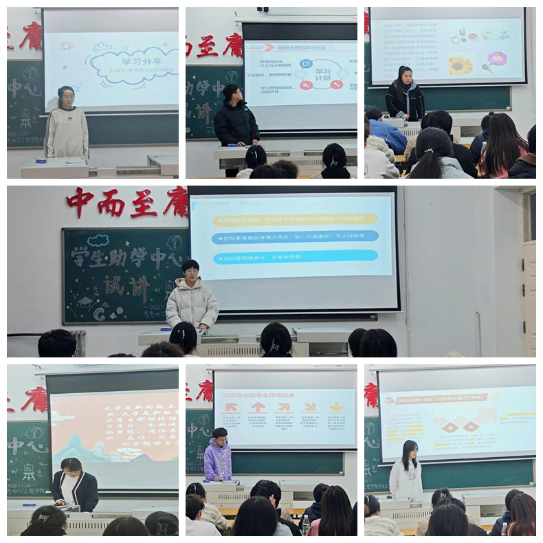 11月21日,在一号教学区1108室,讲师团生助学成员进行试讲,他们来自学校各系各专业,其中包含获得国奖、励志的学生,共30余名学生参加。机电工程系汽服212班李浩男分享如何成为一名合格的大学生;管理工程系英语201班刘春雨分享用实际行动证明“越努力,越幸运”;信息工程系计科211班张越分享思政类课程学习方法以及学好思政课的重要意义;健康护理系护理学专升本221班孙程无忌详细介绍了如何获得国家励志奖学金,激励同学们...