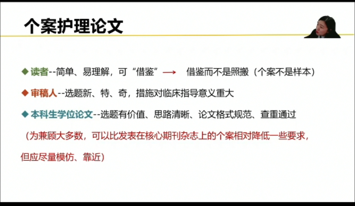 为提高教师指导学生个案报告撰写的能力,11月27日晚,健康与护理系邀请牡丹江医学院护理学院研究生培养科科长李珊珊副教授,采用腾讯会议方式开展个案报告撰写指导讲座,健康与护理系主任郭玲玲、系全体个案报告指导教师、附属建华医院、附属哈尔滨精神专科白渔泡医院护士长参会。在讲座中,李珊珊强调了个案报告在临床实践中的重要性,她指出,个案报告是护理工作中不可或缺的一部分,可以帮助医护人员深入了解患者的病情和护...
