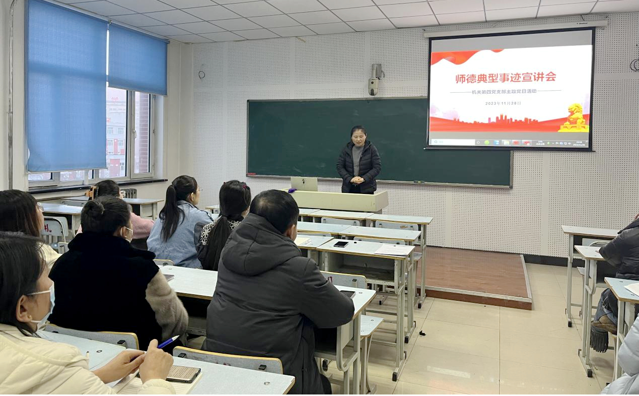 11月28日,机关第四党支部在图书馆410室开展主题党日活动,本次活动主题是“师德典型事迹宣讲会”,机关第四党支部所辖部门全体人员以及资产管理处、财务处、总务处、保卫处、基建办参会,支部宣传委员孙爱萍主持。孙爱萍介绍了此次活动的目的,表示,师德师风是评价教师队伍的第一标准,通过挖掘典型、学习典型,分享师德优秀人物的事迹,弘扬甘于奉献、勇于创新的精神,激发爱岗敬业、关爱学生的热情。财务处张金波老师以“师...