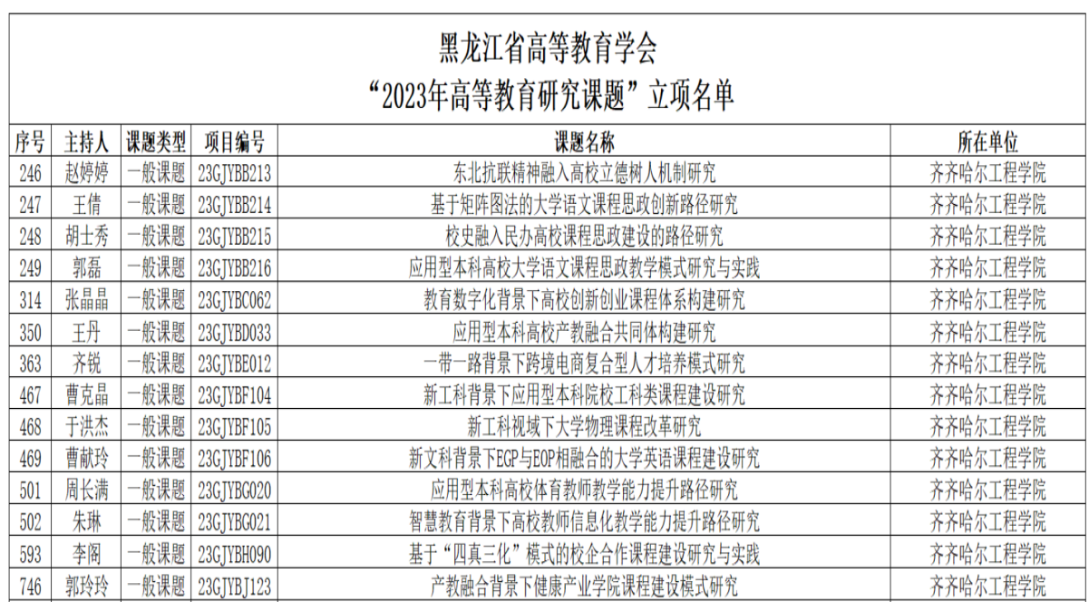 近日,黑龙江省高等教育学会公布“2023年高等教育研究课题”立项评审结果,学校赵婷婷申报的《东北抗联精神融入高校立德树人机制研究》等14项课题获批立项。近年来,我校广大教师紧紧围绕学校应用型课程建设实践,深入开展教育教学及高等教育相关研究,积累了较为丰富的科研基础。此次获批的课题既是对过去我校相关研究的总结提升,也是进一步加强高等教育研究的新起点,学校科研处将指导各课题组做好开题、过程管理、结题等...