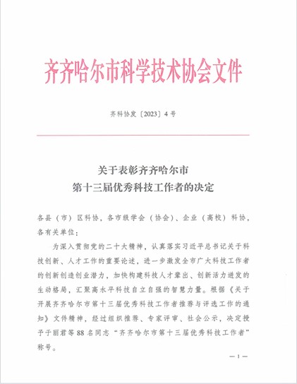 齐齐哈尔市科学技术协会下发《关于表彰齐齐哈尔市第十三届优秀科技工作者的决定》,我校建筑工程系郝丽娜、健康与护理系孙畅、基础部王丽影3名教师荣获“市优秀科技工作者”称号。齐齐哈尔市优秀科技工作者评选工作每两年一届,至此已举办十三届。经基层推荐、专家评审、社会公示,全市共有88名同志被评为“齐齐哈尔市优秀科技工作者”。【撰稿:宋庆永 责编:赵静华 审核:王丹】