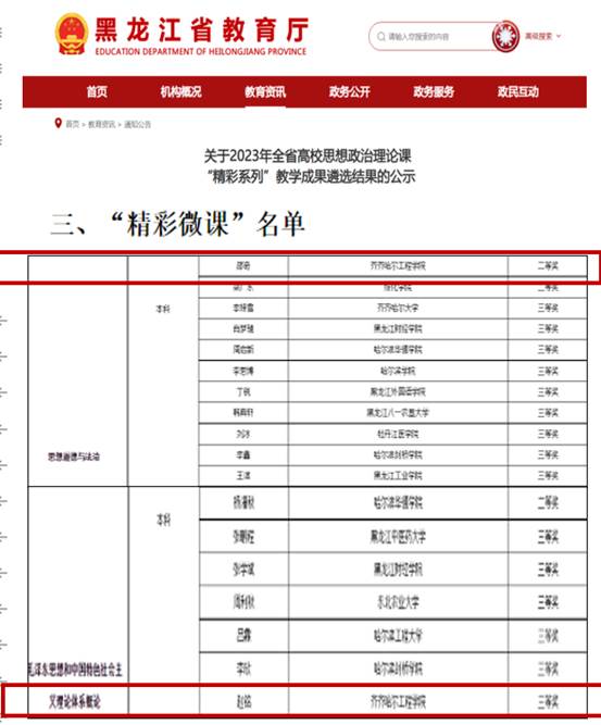 1月10日,黑龙江省教育厅对2023年全省高校思想政治理论课"精彩系列”教学成果遴选结果予以公示,我校马克思主义学院2名教师喜获佳绩,邵奇老师荣获“思想道德与法治”课程“精彩微课”二等奖,赵铭老师荣获“毛泽东思想和中国特色社会主义理论体系概论”课程“精彩微课”三等奖。本次获奖,实现了学校思政课教师在省级“精彩系列”比赛中获奖“零”的突破。全省高校思想政治理论课“精彩系列“教学成果,是全省高校教学成果的重...