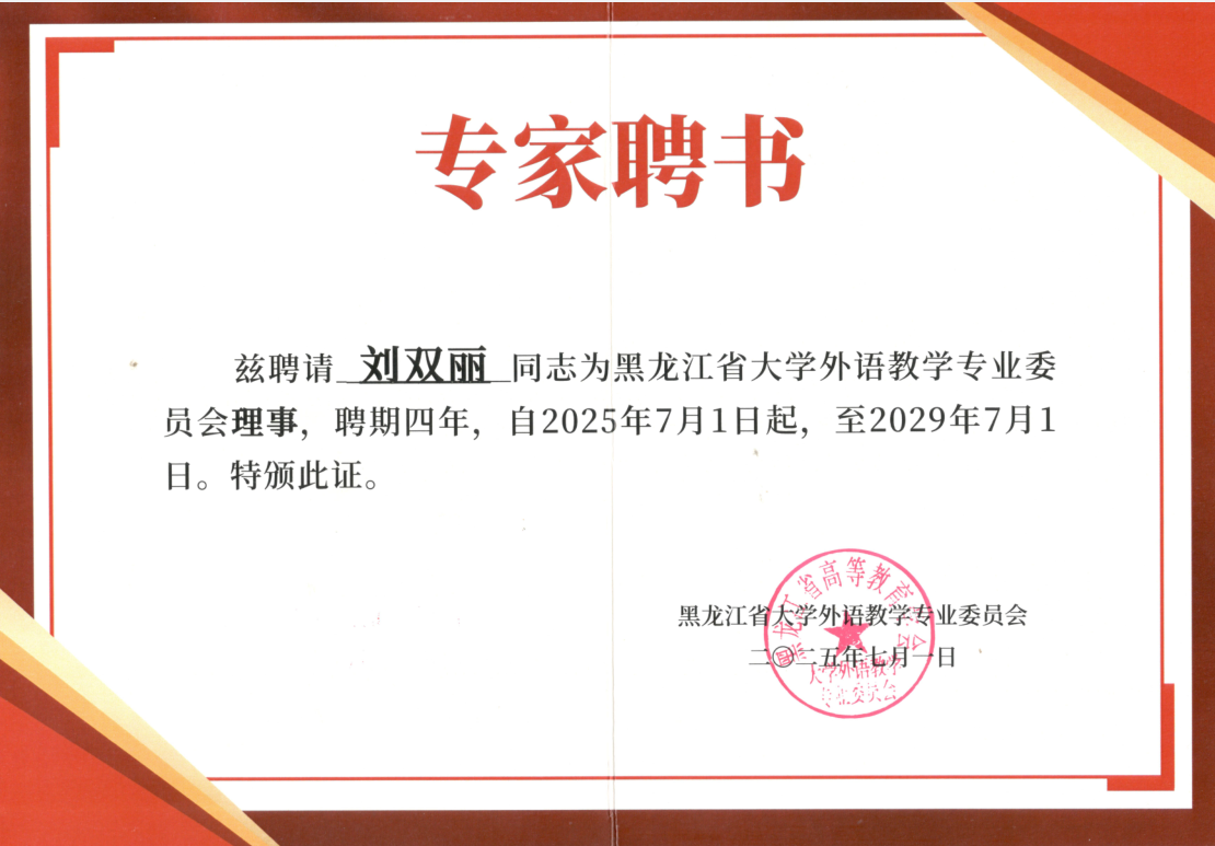 近日,黑龙江省大学外语教学专业委员会向我校通识教育学院刘双丽教授颁发聘书,聘任其担任该专业委员会理事,聘期四年(2025年7月1日—2029年7月1日)。这一任命是对刘双丽在外语教学领域认可,也彰显了我校公共外语教学改革的显著成效。黑龙江省大学外语教学专业委员会是省内外语教育领域的权威指导机构,承担外语教学标准制定、教师培训、教学评估等职能。作为新任理事,刘双丽将参与全省大学英语教学改革规划,重点推动...