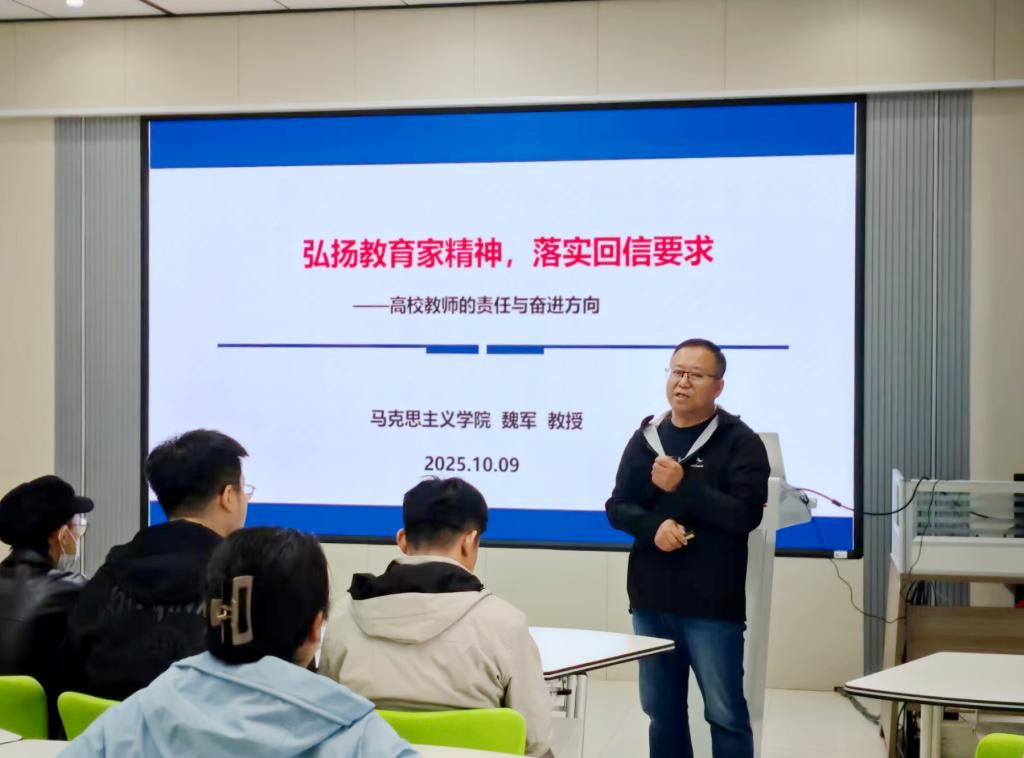 为深入学习领会、全面贯彻落实习近平总书记给全国特岗教师代表的重要回信精神,10月9日下午,教务处组织的专题讲座在2号教学区2102教室举行,马克思主义学院魏军教授应邀为学校教师作专题辅导。魏军教授以“弘扬教育家精神,落实回信要求—— 高校教师的责任与奋进方向”为主题,从深刻认识回信的重大意义、主要内容、时代要求三个层面,系统阐释了回信的深刻内涵与实践路径。讲座中,魏军教授指出要大力弘扬教育家精神,推动...