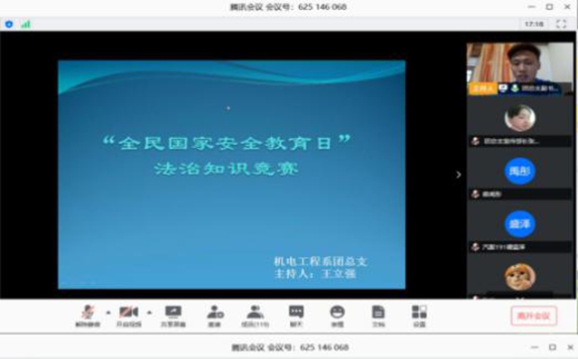 为加强同学们对国家安全法律知识的了解,4月18日,机电系团总支组织“全民国家安全教育日”法律知识竞赛。 竞赛由团总支副书记王立强主持,系学生工作负责人王虹、团委张云慧老师及全体辅导员、团总支各部部长与参赛...