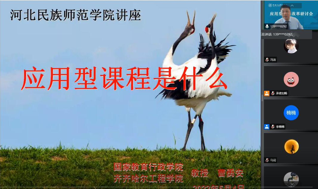 5月4日下午,河北民族师范学院应用型课程改革研讨会在线召开,该校主要领导和全体任课教师参加,理事长曹勇安教授作为出席领导应邀参加,并作《应用型课程是什么》专题讲座。 曹教授对“应用是什么”和“课程是什么...