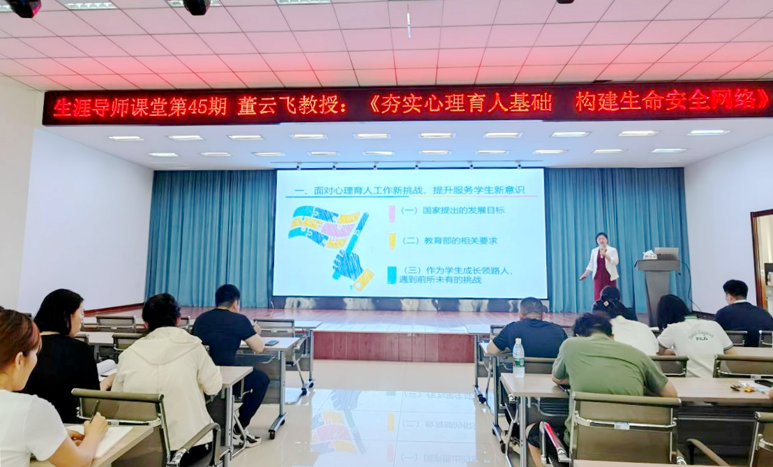 为进一步促进学校心理健康教育工作,提高教师心理健康教育工作水平,6月27日,在二教学区2508会议室,学校心理健康教育中心邀请齐齐哈尔大学学生工作部(学生处)心理健康教育中心董云飞教授,为全校辅导员、生涯导师进行心理健康教育培训,培训会由学生发展中心负责人、心理健康教育中心主任康静主持。董云飞以《夯实心理育人基础 构建生命安全网络》为题进行专题培训。董云飞结合丰富的实践经验,深入浅出地讲解了高校心理健...
